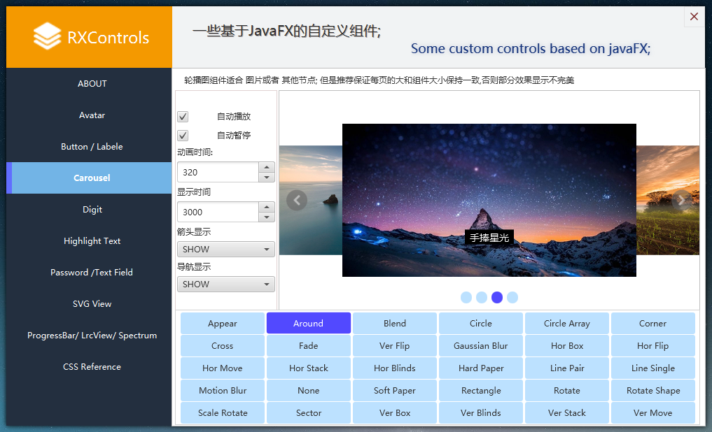Javafx custom component library, password visible component, carousel component, dynamic button component,spectrum component,lyrics component etc...